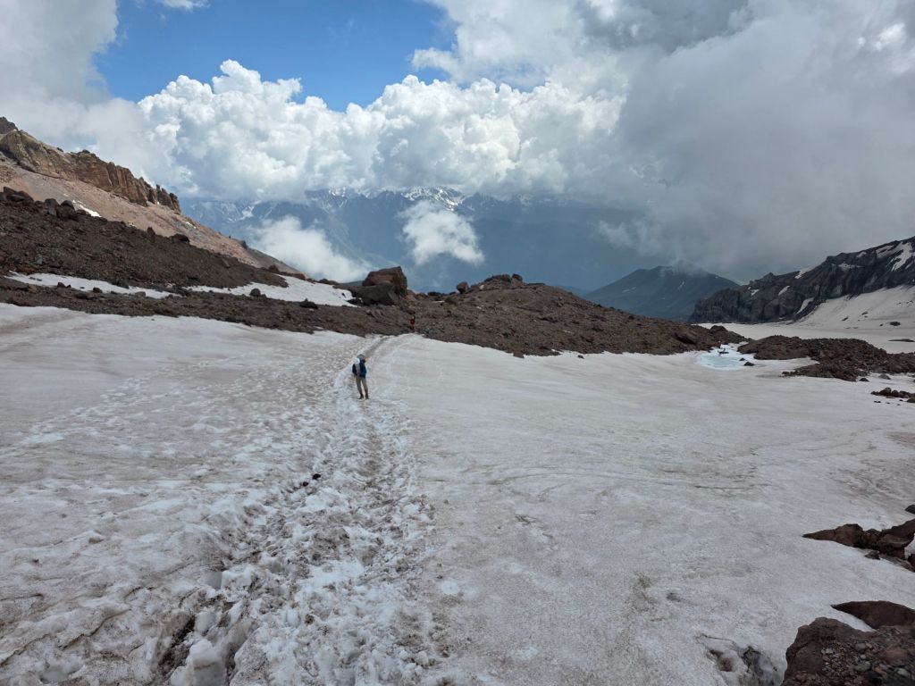 We woke at 7:30 and had a leisurely start. After packing up camp, we left the 3,600m plateau around midday to make our way to the 4,200m camp. The walk wasn’t steep, though the snow patches were pretty soft. We reached camp and had just started setting up the tent when the weather turned —…