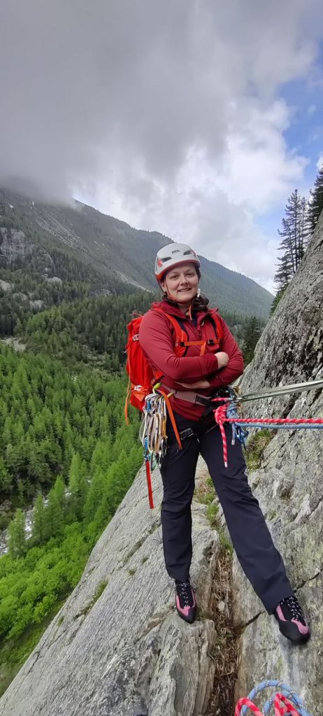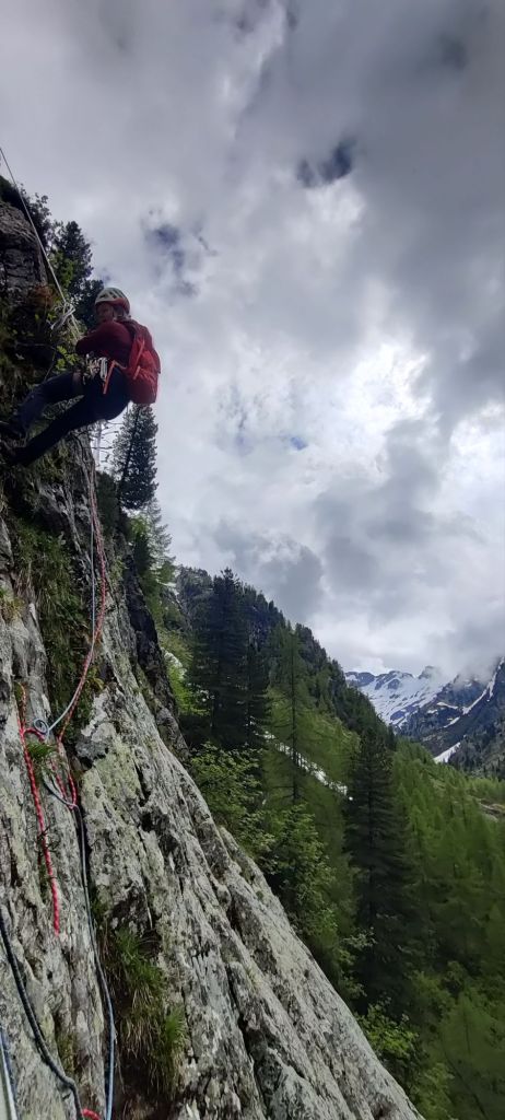I got belayed up, and it was my turn to lead. This next pitch, not only was the rock damp, but it was also slimy. We made the call to bail, as it didn’t look like it would improve anytime soon. We abseiled back down, which was a great couple of abseils! We ate the rest of our lunch, and El flicked her chalk bag down a 10-meter drop, which I got to go and retrieve.
