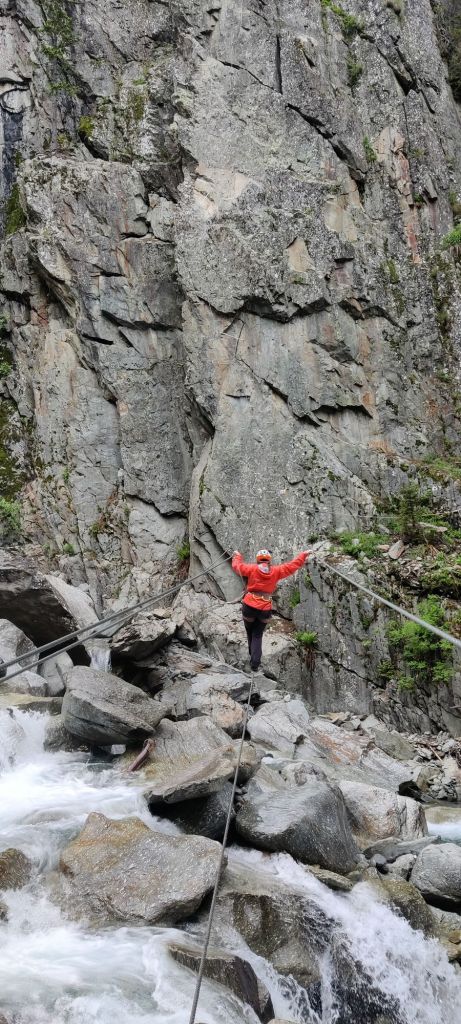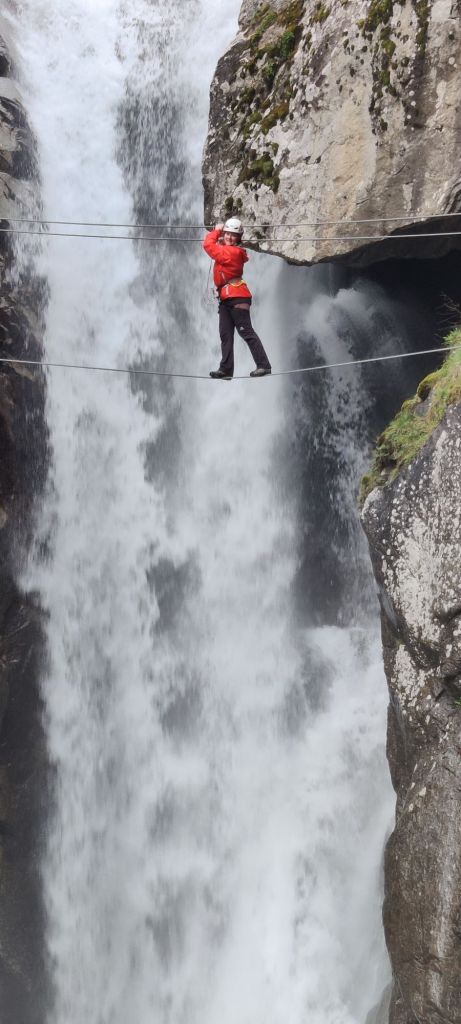 We set off walking back down the valley on the path we should have walked up. I was glad we had missed the turning on the way up the valley. The path was a miserable bog and a bugger to follow. We got spat out on the main track, which we recognized from our winter trip. We decided the Via Ferrata looked brilliant as we passed it in the morning, so since our climb had been cut short, we decided to have a go! We dropped our rope and made makeshift cow’s tails out of slings. As far as Via Ferratas go, this was brilliant! Though not difficult at all, the exposure was incredible! We finished with massive smiles on our faces!