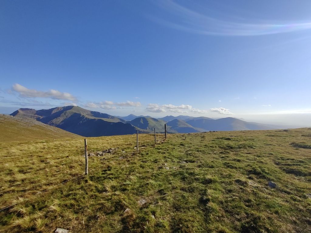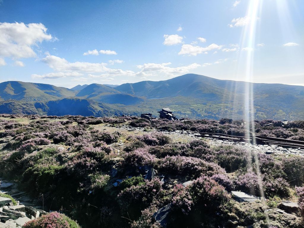 The heather colors were popping, and the blue sky went on forever. The view of the sea over Moel Elio was stunning.