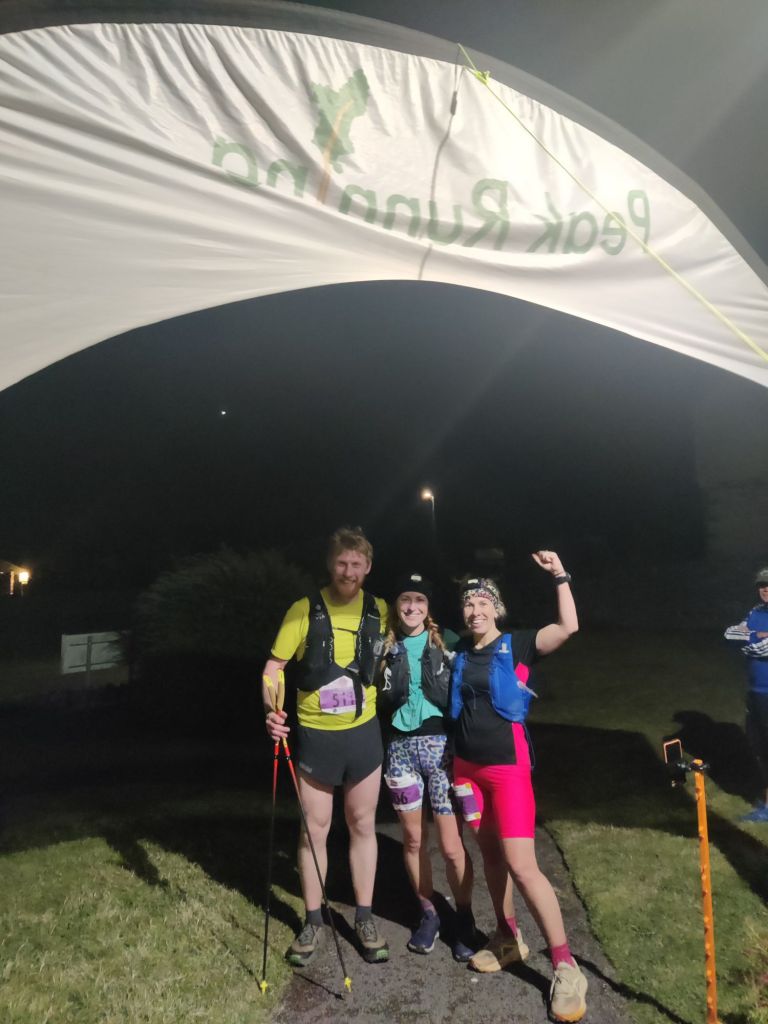 The final push to Monyash was hard work for all of us, as we were low on water, making the run up Lathkill Dale even tougher.I made it to Monyash and was thrilled to see Mum and Sarah. They’d brought a change of clothes for me, along with a frozen flannel to wash my face. Mum also brought a tub of water so I could wash my feet and change my socks. ‘Sod it,’ I thought, and stood in the tub to give myself a really good wash. While I was washing my salty balls, Mum shouted, “That’s my flannel!” to the amusement of some nearby supporters. I apologized profusely, but they seemed entertained by the whole spectacle. I washed my chest and reapplied fresh nipple tape, which the ladies found very funny. Once dressed, I set off running again—next stop, Millers Dale. This stretch was hard with heavy legs but passed quickly enough. As I approached Millers Dale, I ran into the two ladies who had found my nipple tape so amusing earlier. They asked if I’d be putting more on at this stop. I ate some food and set off up the bridleway from Millers Dale. I found Emily and Louise taking the wrong route and tried to correct them, but unfortunately, they listened to someone else who was confidently leading them the wrong way!It got dark en route to Peak Forest, so I put on my head torch. At the gate by Titan, Louise and Emily caught up with me, and we ran the final descent to the village together. We’d had a cracking day, nattering and supporting each other on the trail, so it was nice to finish together. We crossed the finish line in 34th position, 13 hours and 10 minutes after setting off, which we were all super pleased with!After a bowl of chili and a quick chat with the nipple tape ladies, I was invited for a pint with E&L, which was very kind. An excellent way to finish the day—a pint at the Castle! Then, I drove back to Sheffield, slept, and set off to Scotland to holiday with Sam for a week!