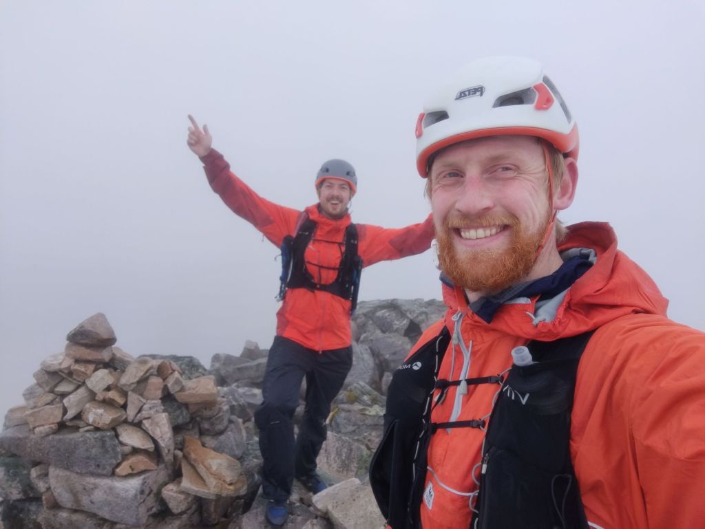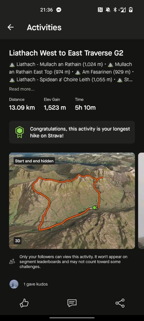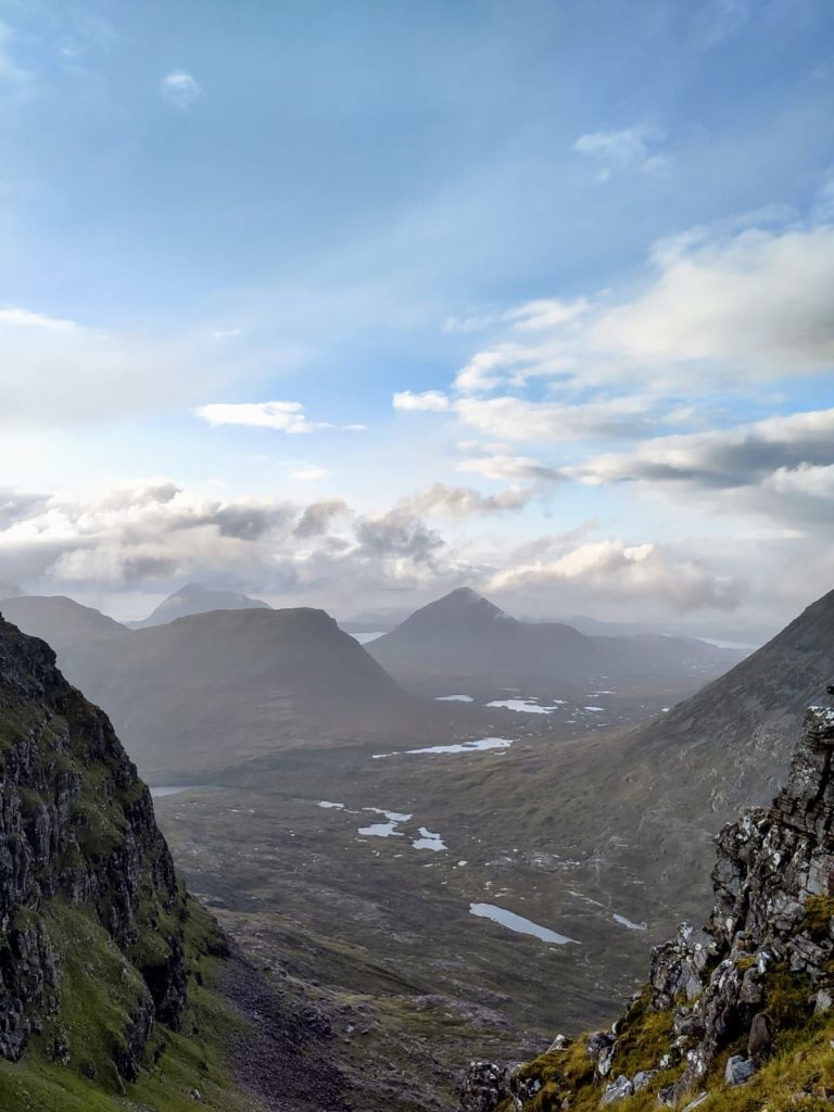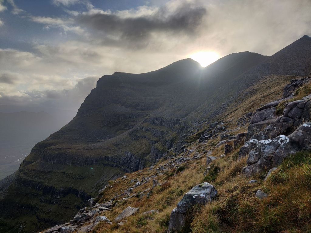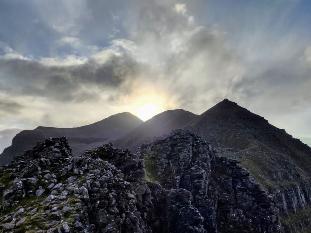 We made our way along quickly as the wind was biting. We eventually summited Liathach—Spidean a’ Choire Leith (1,055 m)—which was a very impressive summit (similar to Great Gable). As we descended, we decided we might as well complete the set, so we summited Stuc a’ Choire Dhuibh Bhig (915 m). At this point, the clouds gave way to reveal some impressive views in golden hour lighting, which made the whole traverse worthwhile!