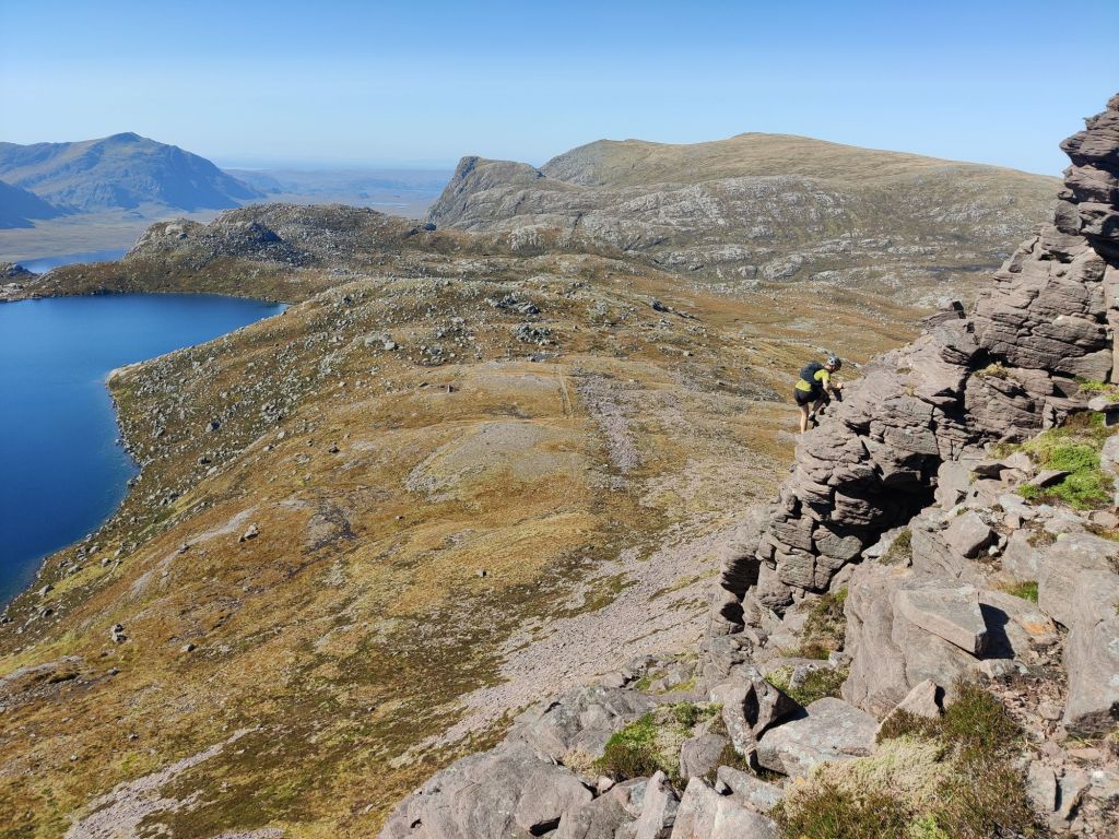 We couldn’t gawp for too long as time was pressing on, and we still had another scramble and Munro to summit. On the descent, we bumped into the woman we met on the way in, who was now on her way up this Munro. We sat and chatted for a bit before continuing on our way.
