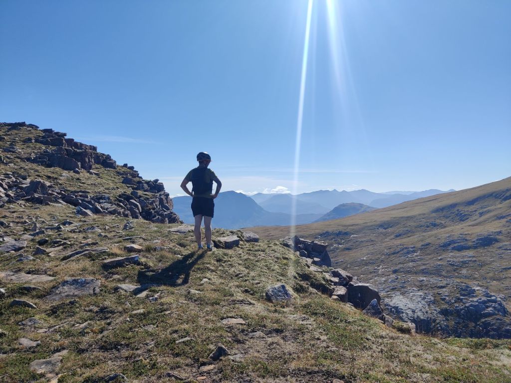 Lunchtime! I’d packed some cheese and pickle sarnies for us to tuck into. We ate them on the edge of Fuar Loch Mòr, in perfect view of the two Munros we had yet to tackle. Ruadh Stac Mòr was our first destination, but there was no set route to the summit. We spotted some exposed rocks and decided to scramble up them, which gave us easy access to the top. The view from up here was so rewarding; we could see across the Fisherfields, Fannocks, and An Teallach Munros – the latter will be our final mission before heading back to England. Just wow.