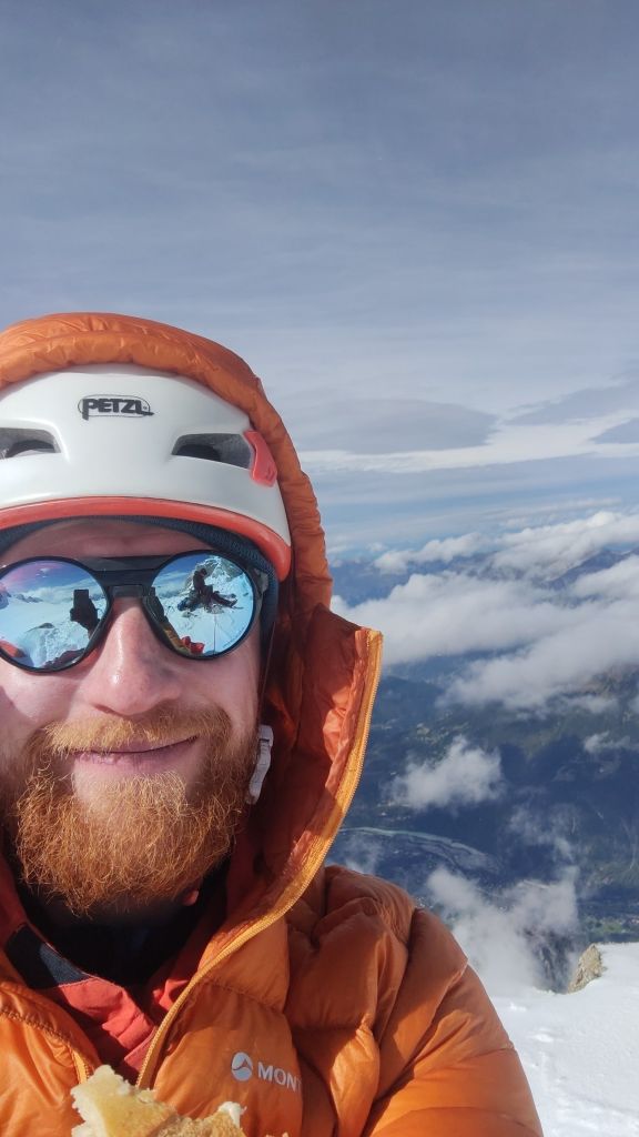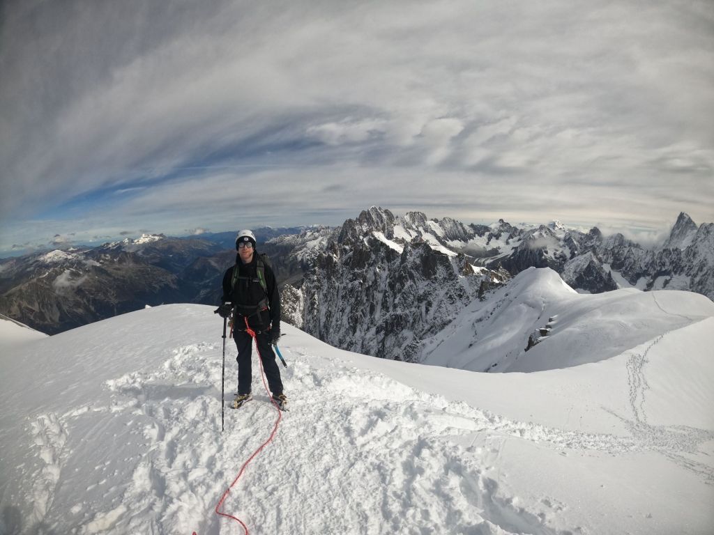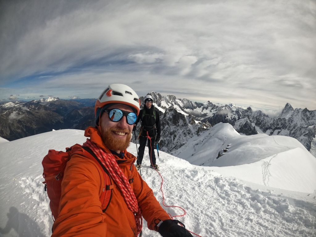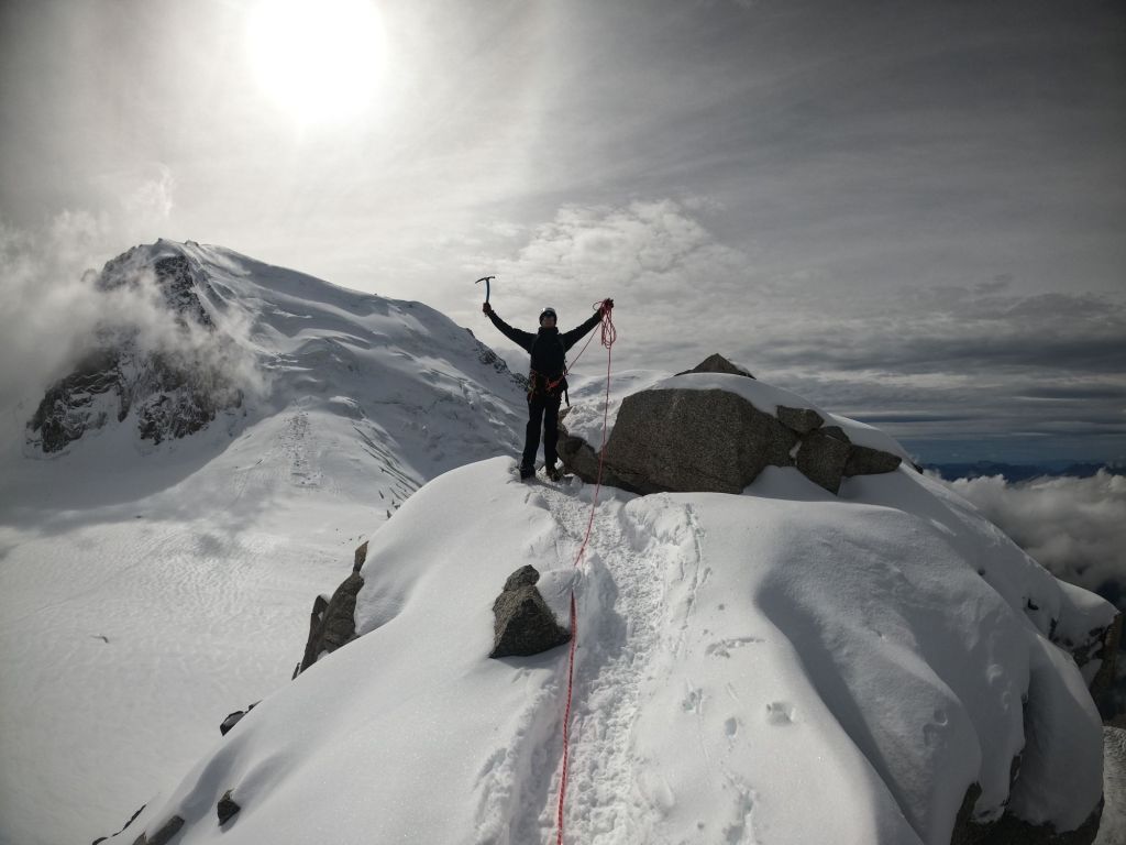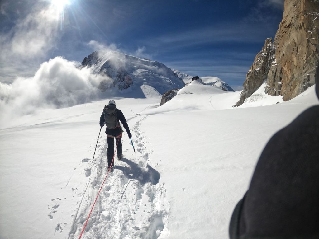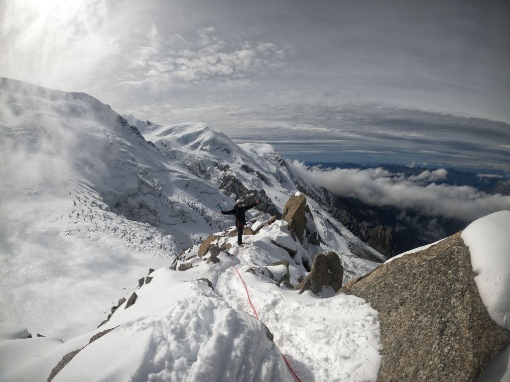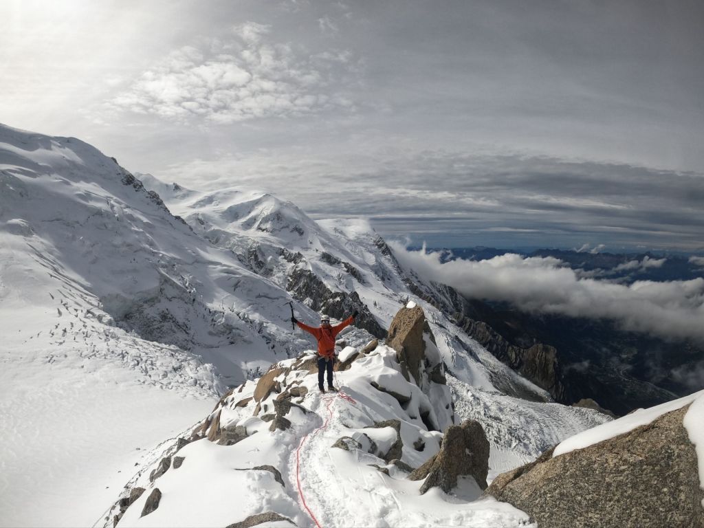 We reached the crux, where I lowered Mike down first and then abseiled down myself. From there, it was only a short walk to the Cosmiques Hut, where we quickly enjoyed a hot chocolate. The rush was because the weather had turned, and we wanted to ensure we caught the lift back down! We set off across the glacier at a brisk pace, with Mike leading the way. As we started the uphill section, I took the lead, short-roping Mike to maintain our pace. We arrived at the lift station with plenty of time, once again attracting the attention of camera-wielding tourists who wanted photos with us. I decided to join in on the fun, handing out the ice axe as a prop—which only encouraged more people to join in!
