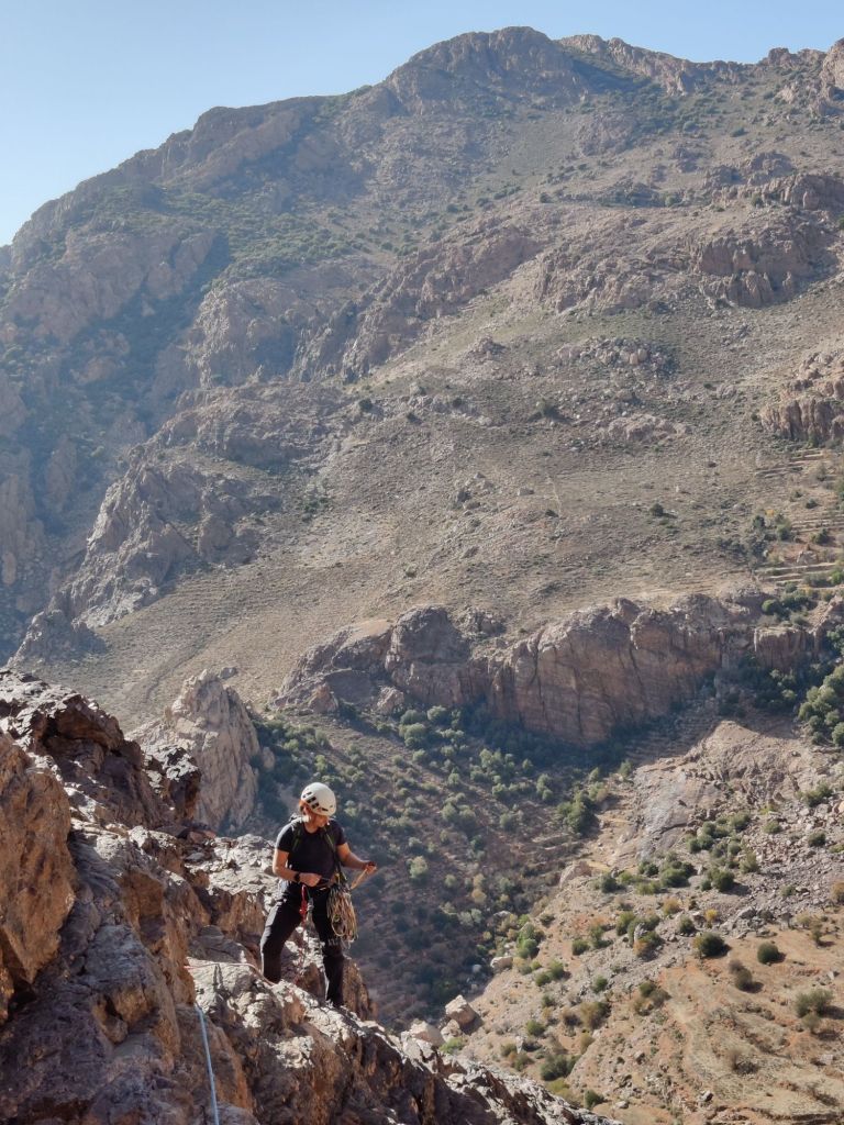 This time, we decided on a nice, easy day to ease back into climbing in Morocco. Our route of choice was Talk Armada (VS 4b), a nine-pitch climb. I led the first pitch, which was brilliant—easy route-finding thanks to someone who’d previously climbed it and left plenty of chalk marks.