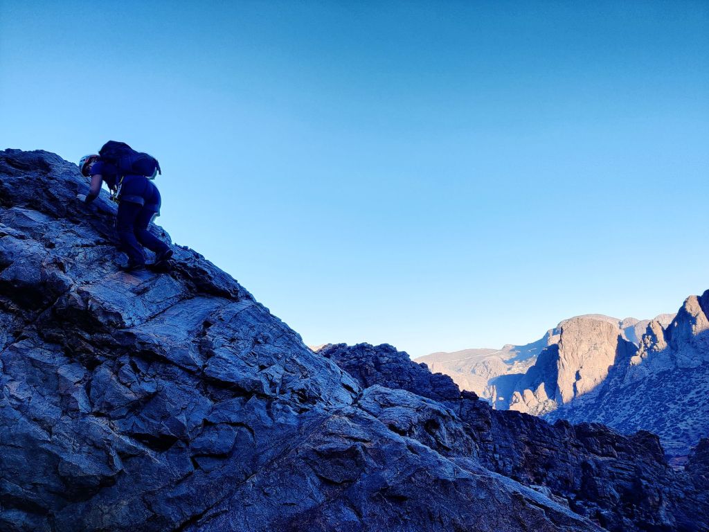 We reached the road under Figtree Crag and decided to run down. After a few minutes, I realized running with my bag’s weight was ridiculous, so I left El with the bags and ran a few kilometers down the road to fetch the car. It was great to finish such a big day while there was still daylight, and we drove back to the Kasbah looking forward to a well-earned rest and dinner!