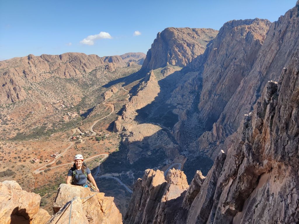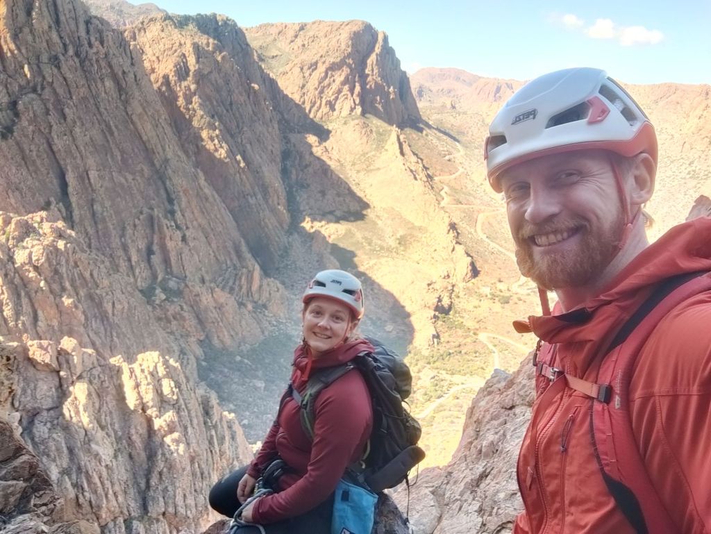 After another sandwich, El led us around to the base of The Priest, all while singing the call to prayer. This led us to the 5b pitch—the real crux of the climb. The Priest stood about 2 meters away from the main wall and crack, so I had to bridge across the gap, hands on one side, feet on the other. From this precarious position, I edged along the wall until I was level with the crack, placed a couple of large cams, and committed. Getting my feet across the gap onto the steep wall was nerve-wracking. From there, it was all about hand jamming and working my way up, placing another cam higher up for good measure. It was a proper struggle, but I made it to the top! This was definitely the hardest pitch I’ve climbed so far. El followed, and from there we scrambled another hundred meters or so, including an awkward chimney, to reach the summit.