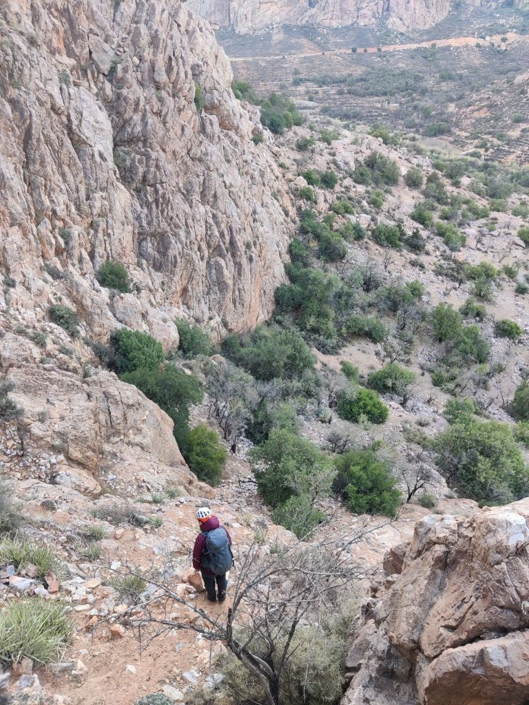 A massive 11pitch VS route was on the cards for today. We woke at 5.45 to leave the Kazbah by 6.20. This way we’d be at the base of the climb for daylight to ensure we used every hour of light. The path was very easy to follow, though El didn’t feel great. At the base, before the first section of scrambling, I spotted deer silhouetted on the route we were supposed to be climbing. They looked beautiful with the sky getting lighter behind them, as the sun rose – Incredible!