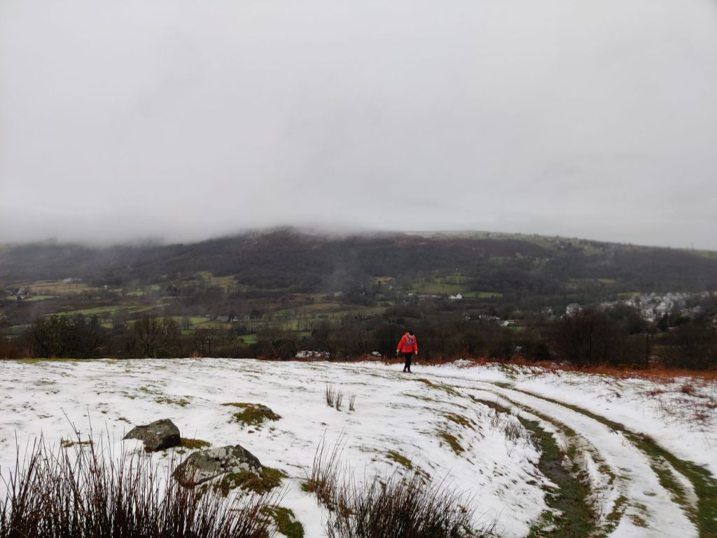 We drove to Penygroes and left a car there, starting our run up through the stunning slate quarry. The Welsh views were cracking as we climbed. The real adventure began when we crossed the plateau beneath Mynydd Mawr, skirting around Moel Tryfan. That section was a proper challenge—at least ankle-deep in flowing snowmelt! El was chuffed to find out just how good the VJ I Rocks I got her for Christmas really were. The rain, meanwhile, was blowing sideways, so by the time we reached the descent to Waunfawr, we were ready to get out of the wind.