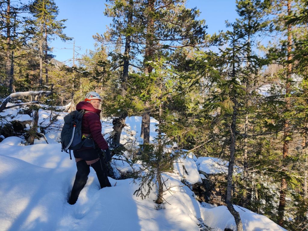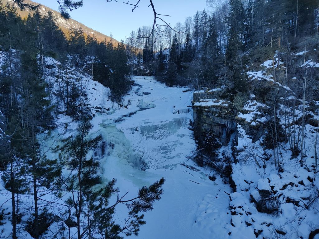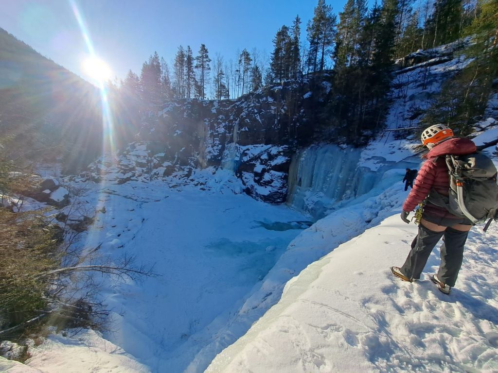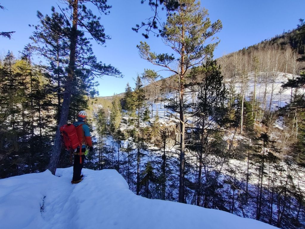 As we left the car, we bumped into Cece and Daryl, who we’d chatted to briefly at Krokan the day before. El and I went looking for the 30-metre abseil into the gorge, but couldn’t find it — and the river ice looked a bit too thin to risk crossing.