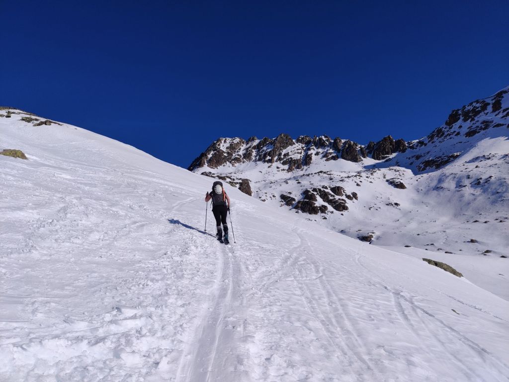 I descended first and caught up with El, who had already started heading down to avoid getting too cold. We skied back down together, leaving the others to descend as a team.