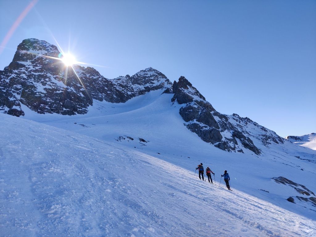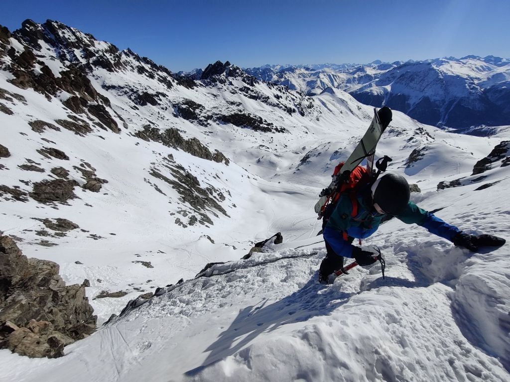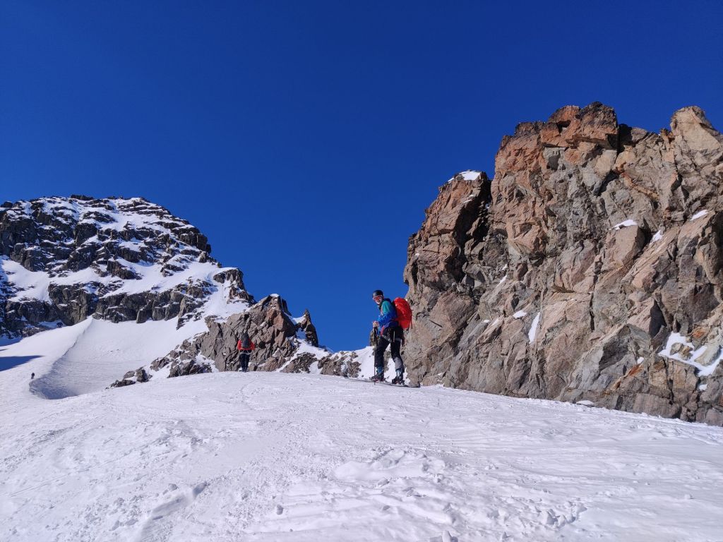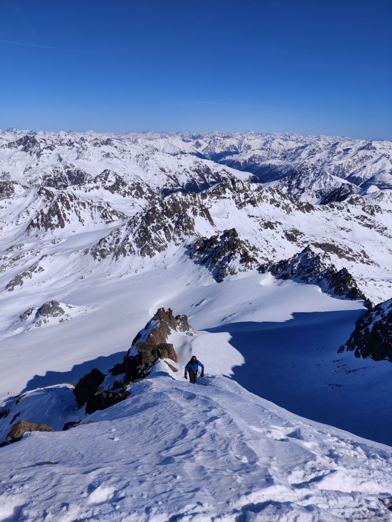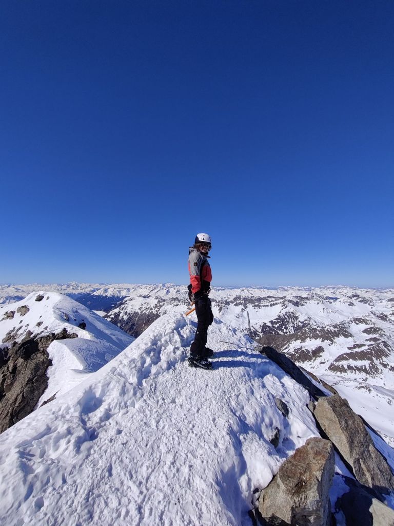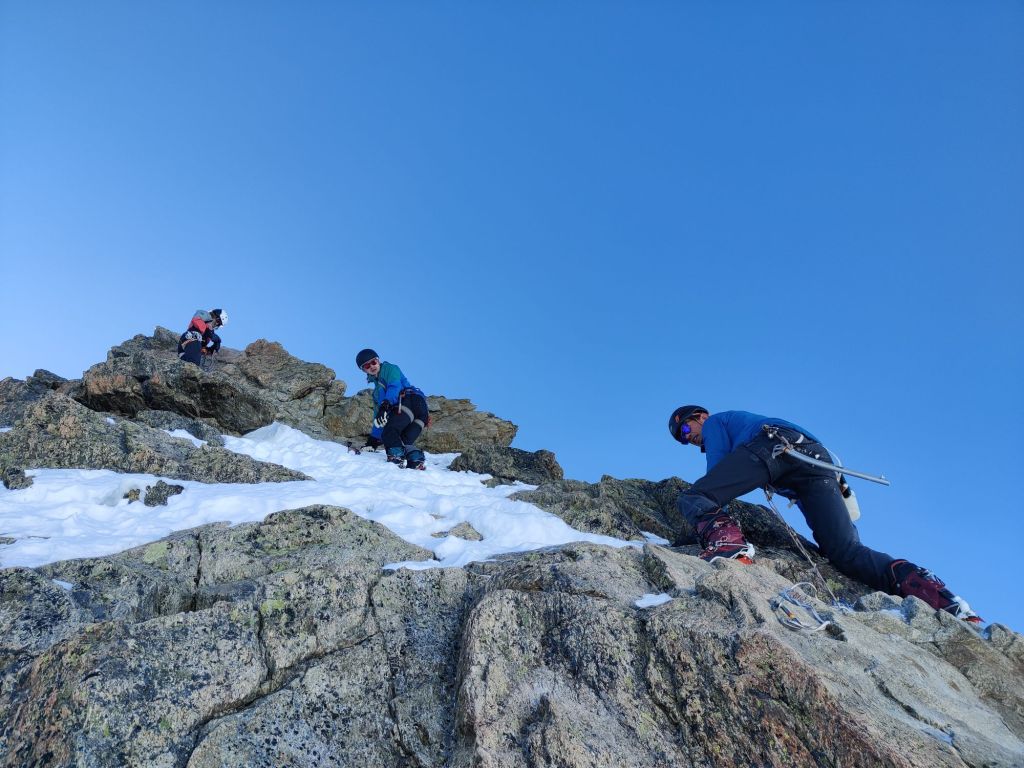 Just below the col, we swapped skis for crampons and climbed the final 40m. From there, we descended onto the glacier and skinned up to the base of Piz Kesch. We ditched our skis and started the climb, deciding to leave the rope behind after watching others descend without using one. As we climbed, we quickly realised that every other team was using ropes, but we felt comfortable enough to carry on without.