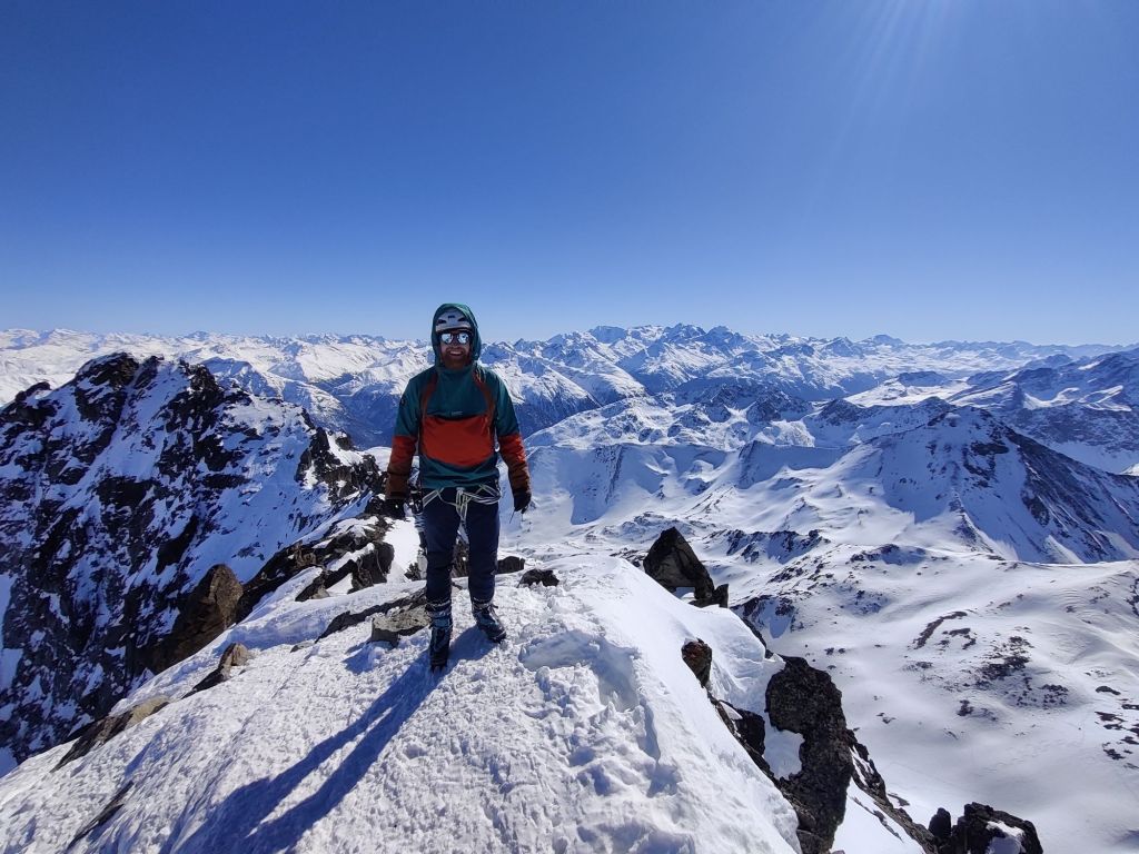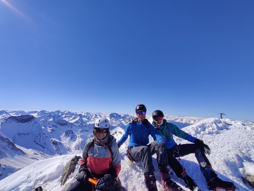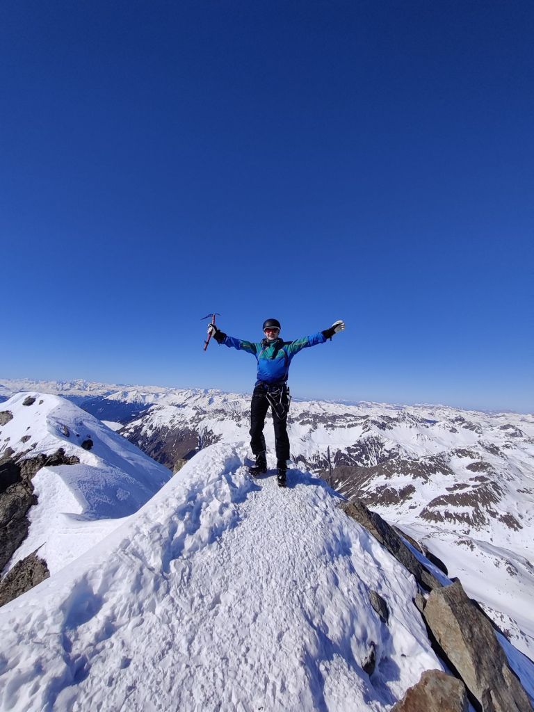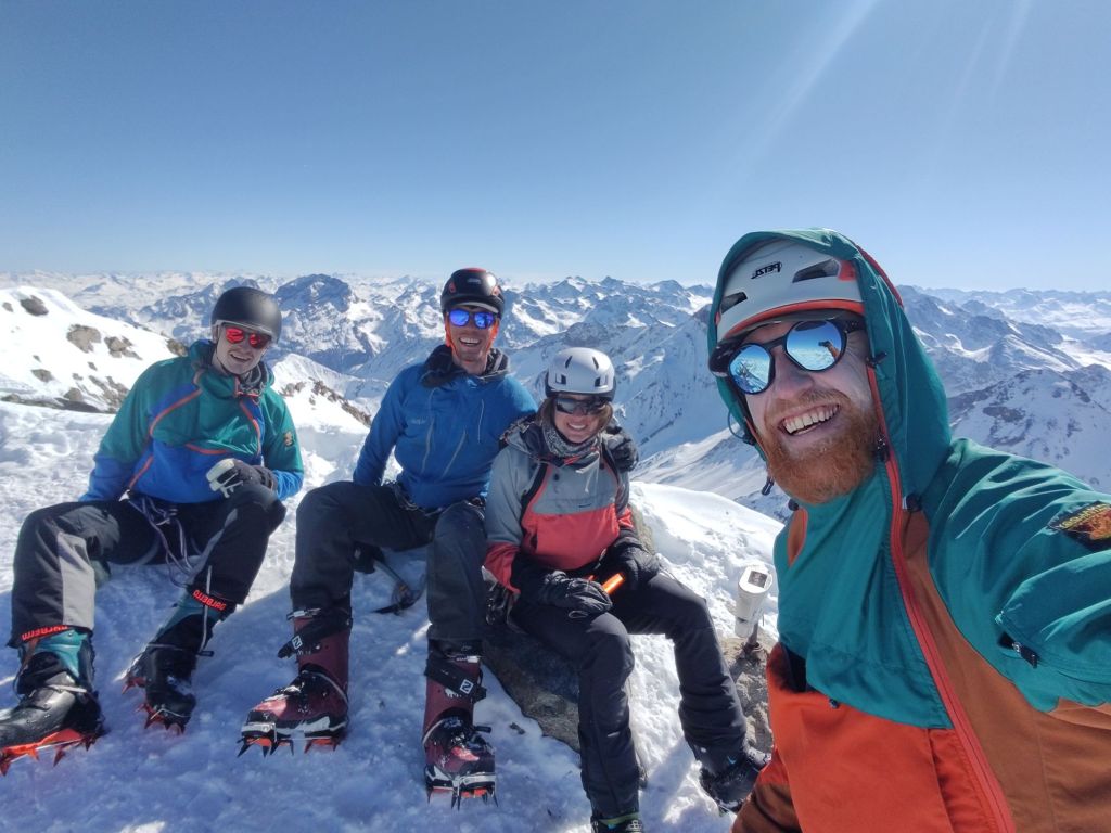 The snow ascent led to a rock ledge, which we had to climb. Hannah went first, and I followed. El, Chris, and Barney weren’t comfortable with the move and chose to wait—a solid call. Hannah and I pushed on and reached the summit at 3,417m. On the way down, we were just talking about how great it is to have friends who are happy to sit out sections they don’t feel comfortable with when we rounded a corner and spotted Chris and Barney. They’d egged each other on and made the climb after all. No hesitation—Hannah and I turned back and summited again with them.