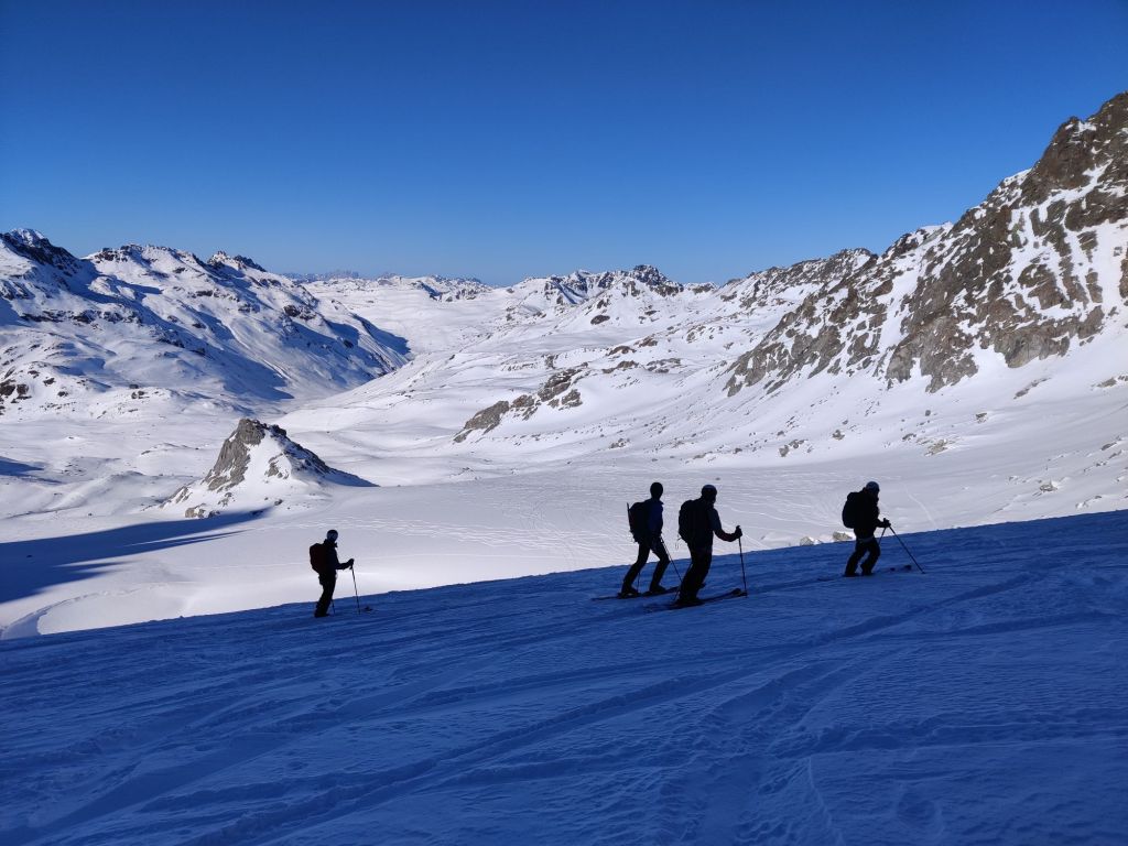 Once back on the glacier, we clipped in and skied down through incredible powder, softened perfectly by a few hours of sun. We arrived at the Kesch Hut to discover there was no running water—no worries, beer and bottled water sorted that. Compared to the other huts, though, Kesch felt very unwelcoming. The staff weren’t particularly helpful, and overall, it was, without question, the least friendly hut of the tour.