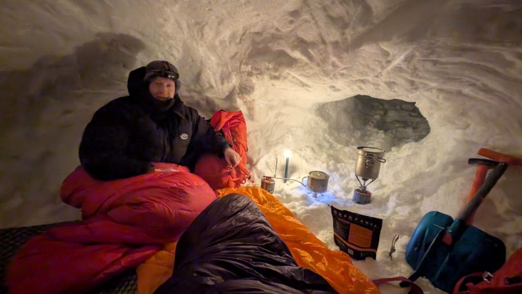 We cooked an expedition meal, then settled in for the night. Despite the -26°C temperatures outside, the inside of the snow hole was toasty. We slept surprisingly well — just waking now and then to clear the entrance, as spindrift kept blowing in.