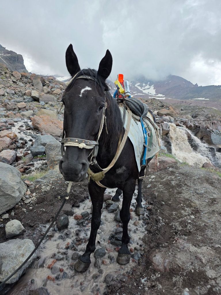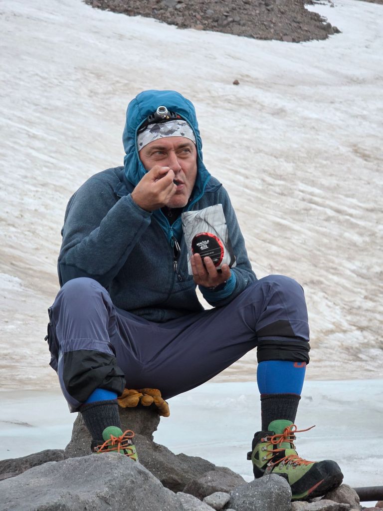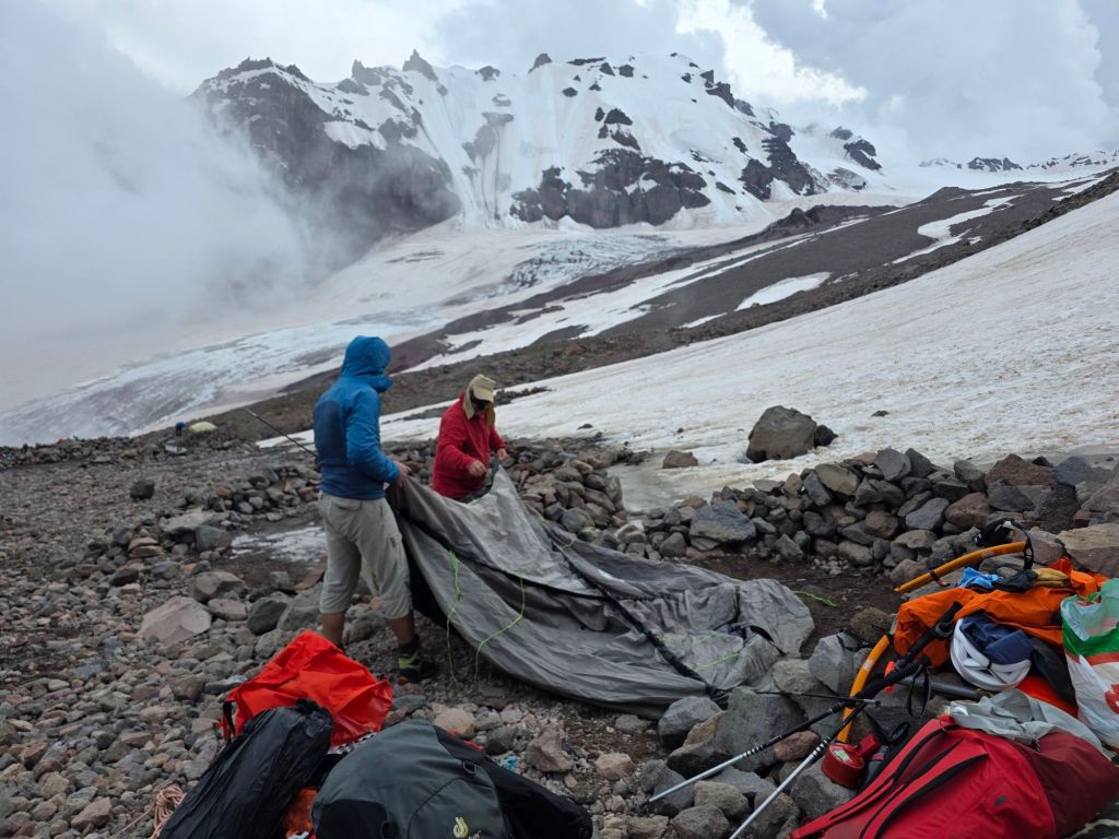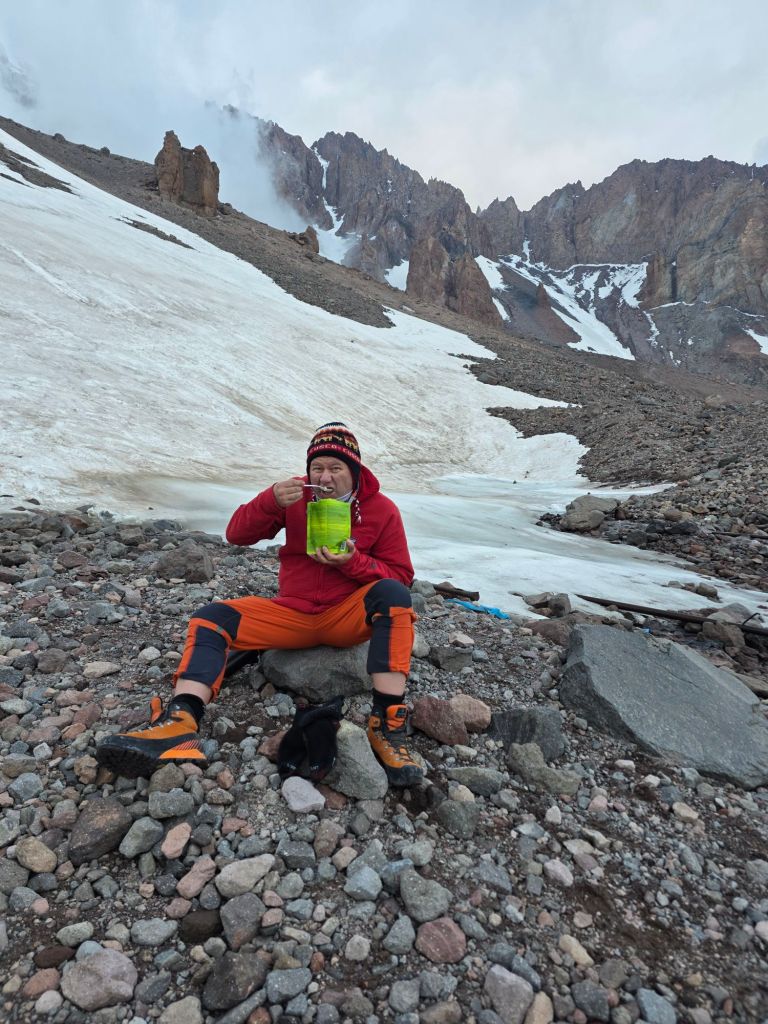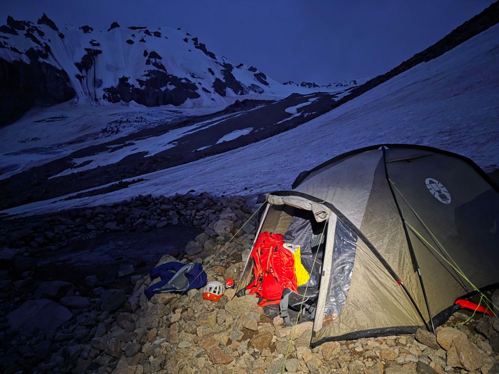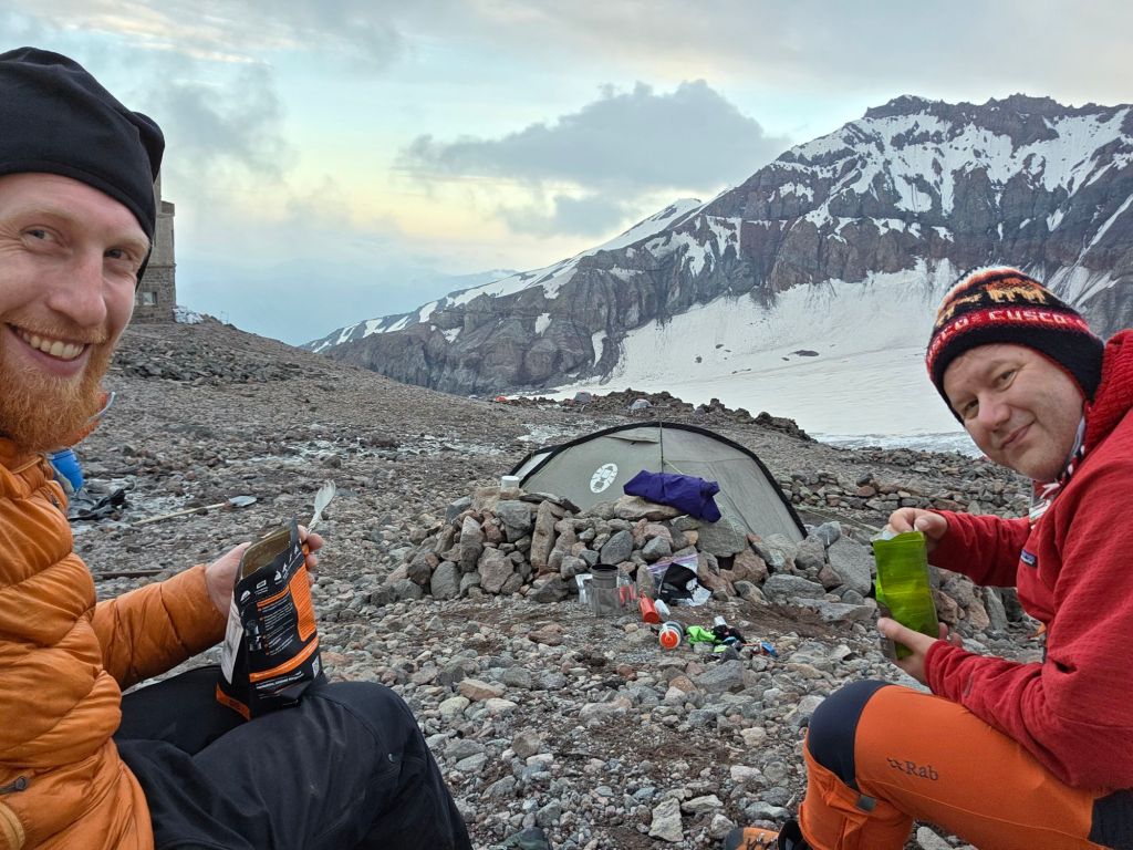 We crossed over and climbed to the 3,600m hut, where we pitched the tent and got dinner going. It got dark around 9:30, so we turned in for an early night, ready for whatever tomorrow brings.